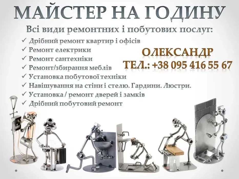Опис"Якщо у вас вдома проблеми з електрикою, дверима чи чимось іншим, вам допоможе наш "Чоловік на Годину". Він розбирається в усіх питаннях, особливо в електриці. Якщо лампочки мерехтять або розетки дивно працюють, він швидко все наладить. Просто покличте його за номером +38********67 і забудьте про всі технічні непорозуміння вдома!"